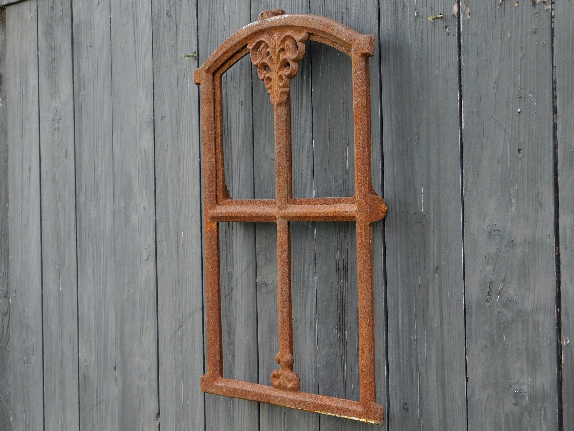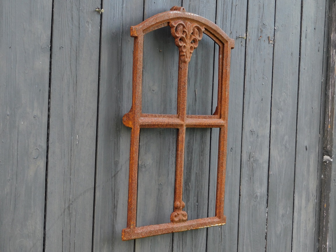 Dit authentieke gietijzeren stalraam met kiepfunctie is een prachtige decoratieve én functionele toevoeging. Het raam is onbehandeld en heeft een natuurlijke roestlaag, waardoor het de uitstraling krijgt van echt antiek. Met een totale afmeting van ca. 46,5 cm hoog en 33,5 cm breed is dit raam geschikt voor renovatieprojecten, tuinmuren of als bijzondere decoratie in en rondom huis.