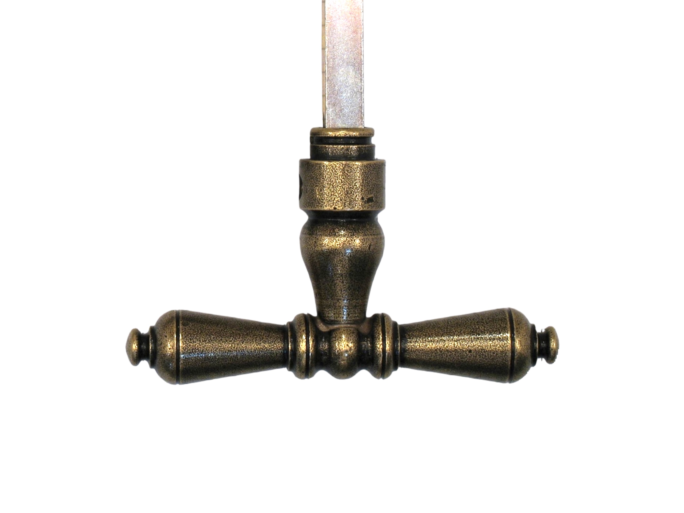 Leveringsomvang: klink, T-model, messing antiek, inclusief doorn.