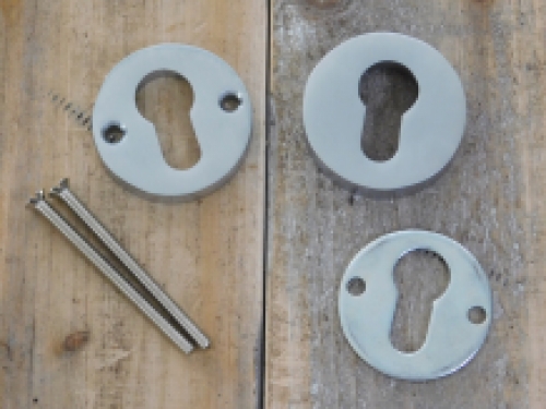 Sicherheitsrosette Chrom mattiert, Schlossrosette für Profilzylinderschloss Sehr hochwertig verarbeitete Sicherheitsschlossrosette. Aus mattiertem Nickel gefertigt, passt die Schlüsselrose sehr gut sowohl an antike als auch an moderne Türen. Diese stabile Rosette kann zur Sicherheit nicht von außen abgeschraubt werden, da sie auf der Rückseite befestigt ist. Auf einem der Bilder ist zu sehen, wie das Profilzylinderschloss bündig in eine patinierte Messingrosette eingesetzt ist.