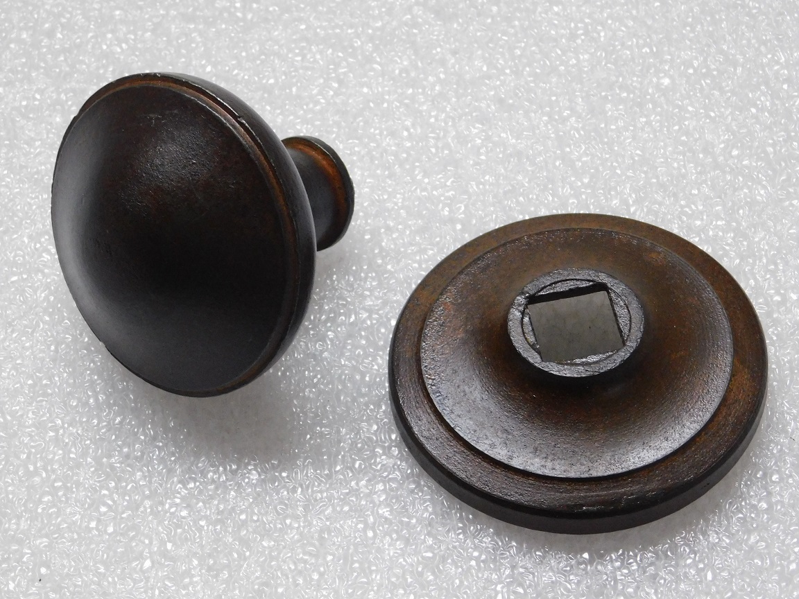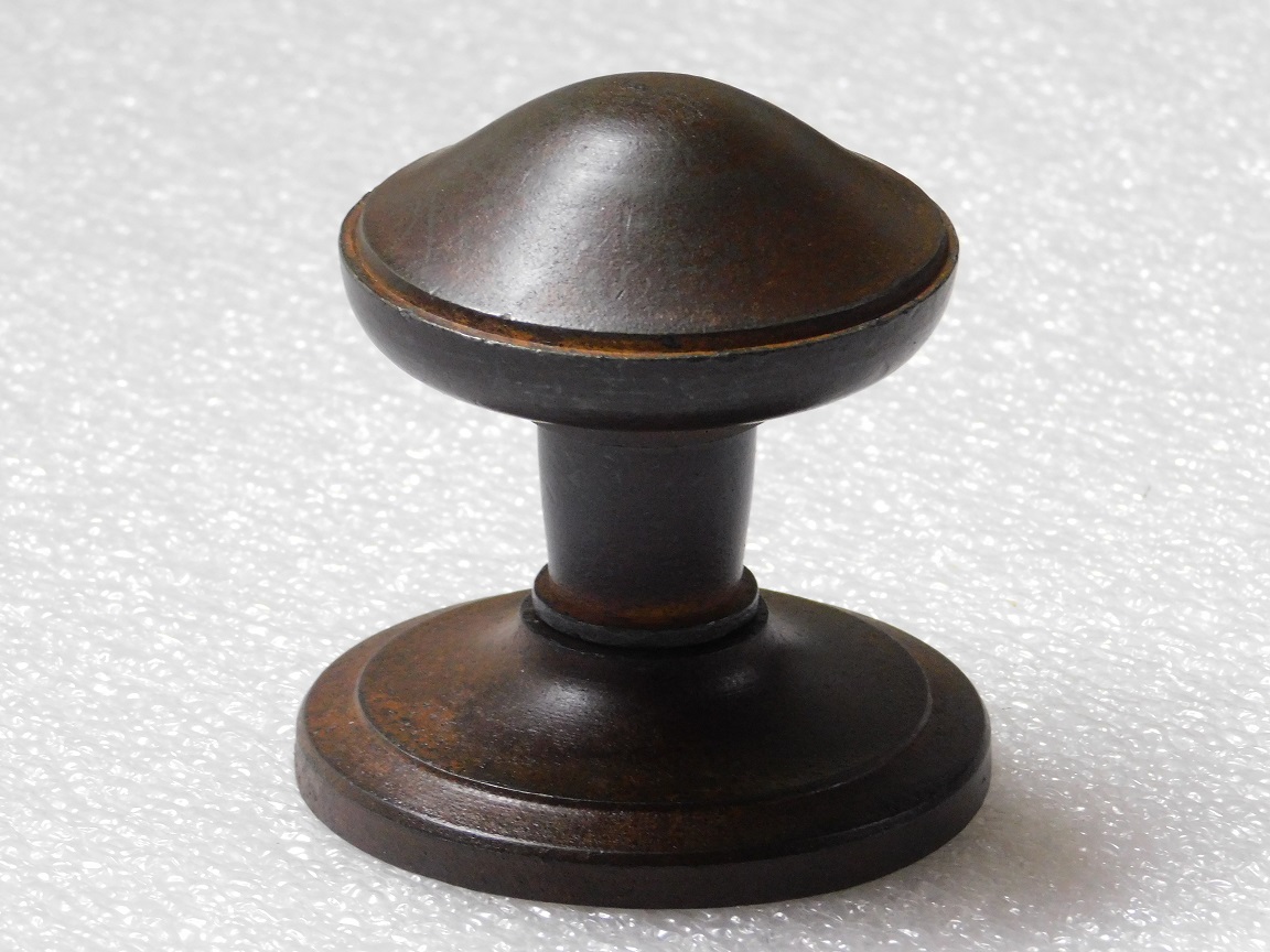 Deze stevige knop, met een diameter van circa 7 cm, is vervaardigd uit massief ijzer en afgewerkt in een warme roestkleur.