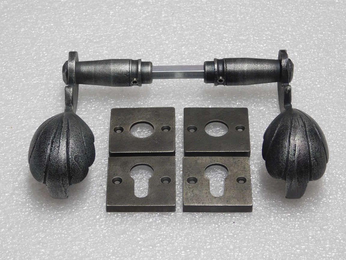 Set Türgriffe Vienna + Türgriff- und Schlossrosetten, quadratisch – Gusseisen, verzinkt