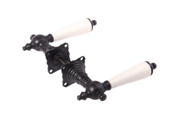 Klinkenset inclusief rozetten, vervaardigd naar historische originelen, waardoor de set een klassieke sfeer met zich meebrengt. Gietijzeren klinken, met een zwarte kleur en wit porseleinen handvaten.