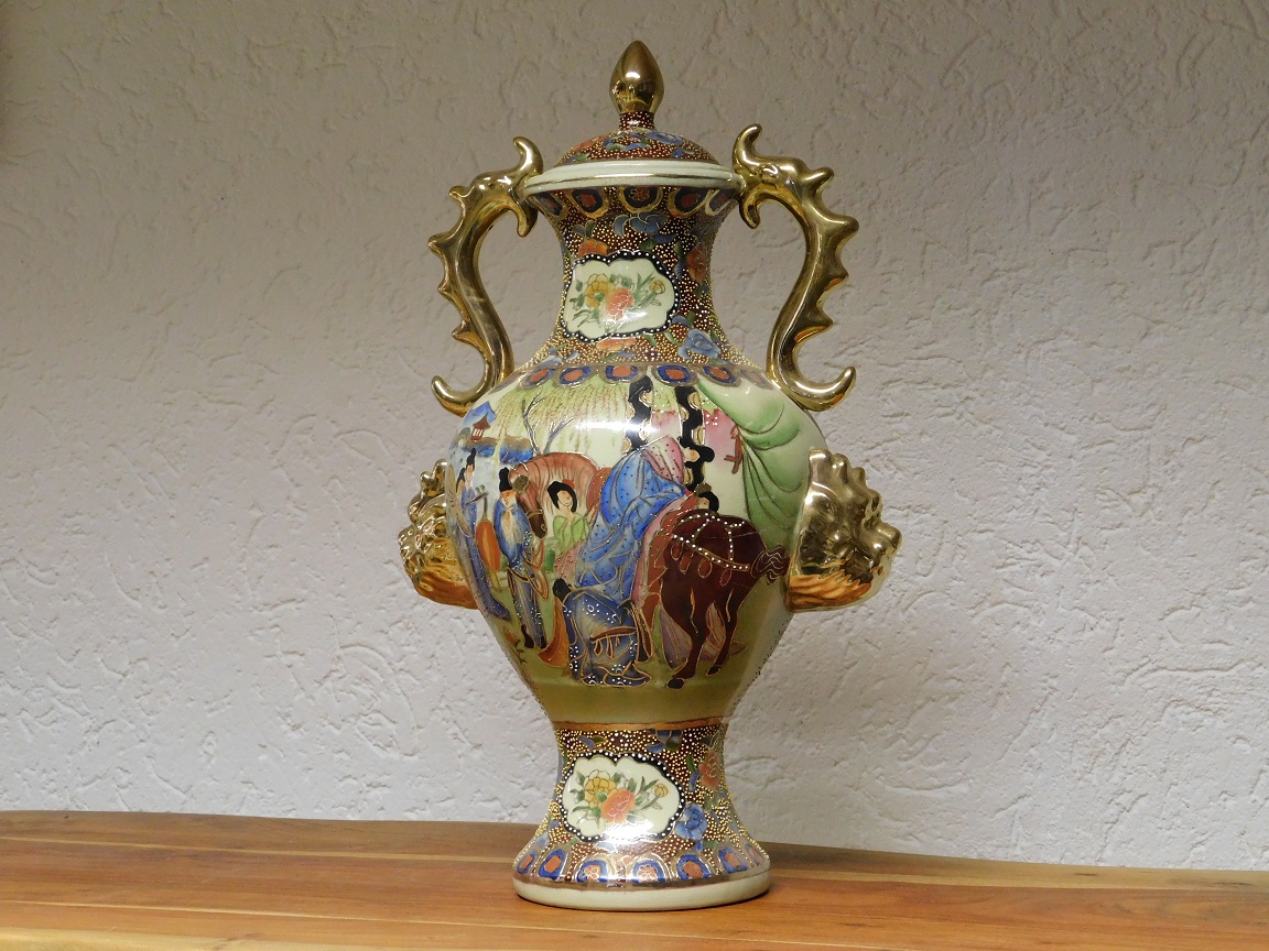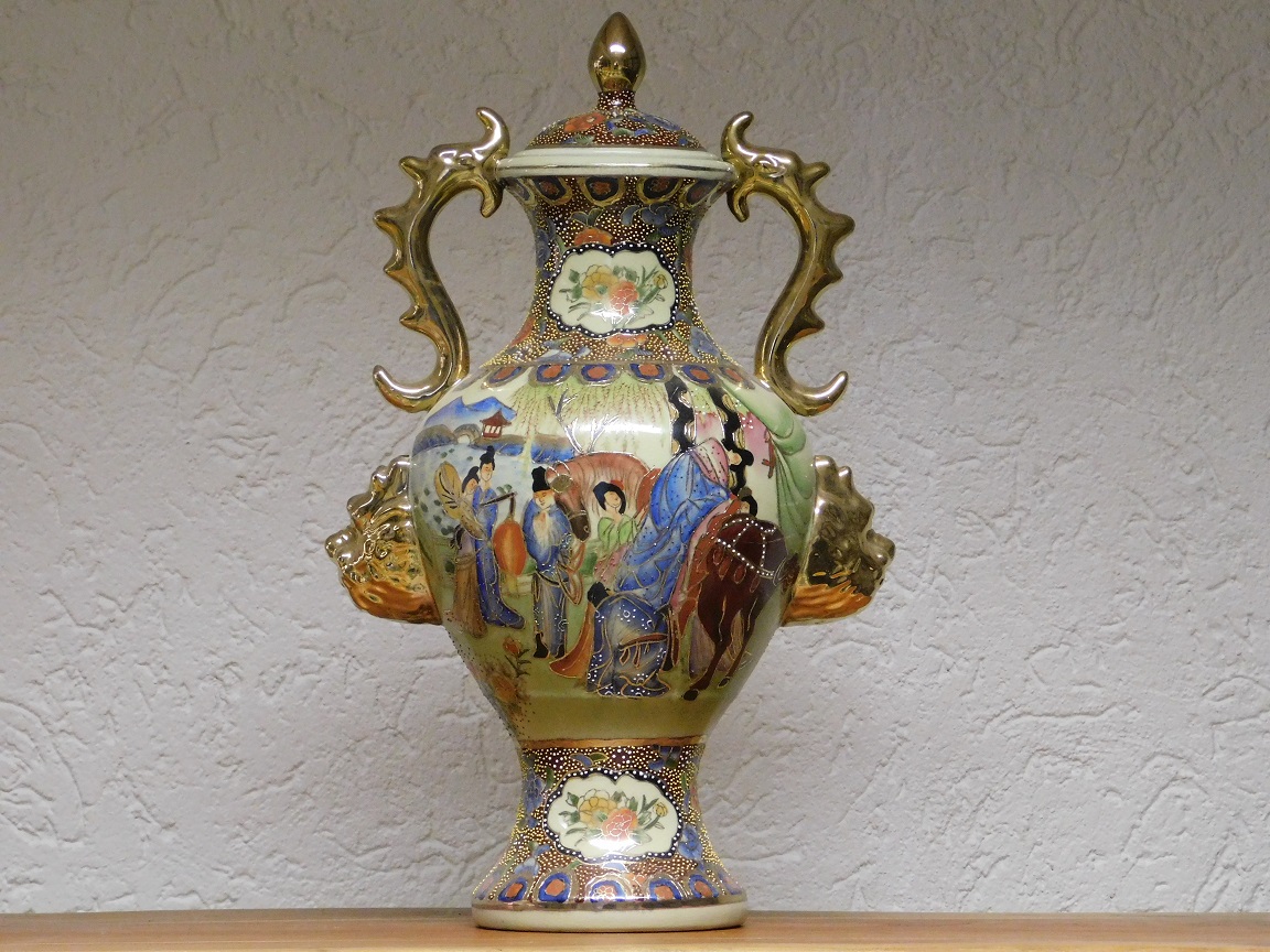 De gedetailleerde decoraties, rijke kleurtonen en fijne goudaccenten zijn kenmerkend voor de traditionele Satsuma-stijl.