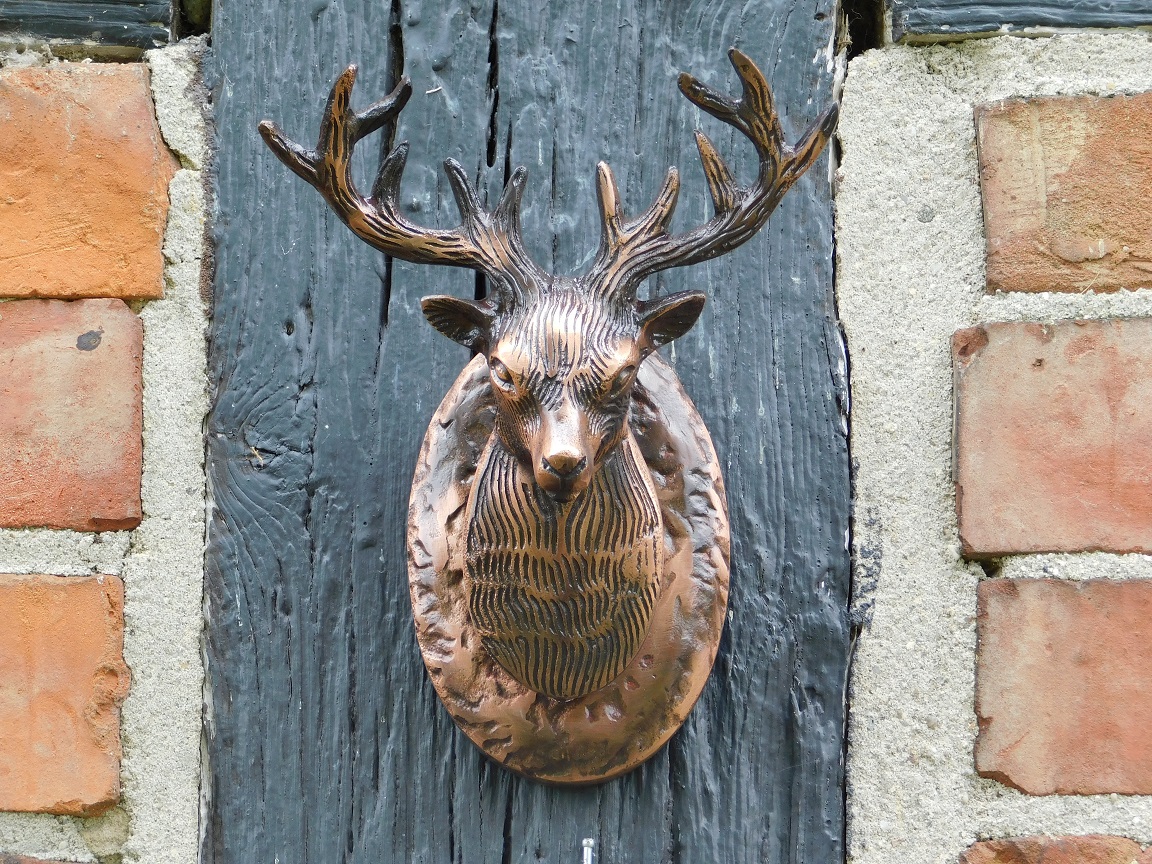 Wunderschön gestalteter Türklopfer in Form eines Hirschkopfes, aus antikem Eisen in Kupferfarbe!