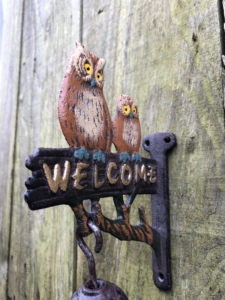 Een leuke deurbel, voor de voordeur of tuindeur met handgeschilderde uilen met tekstbord "WELCOME".