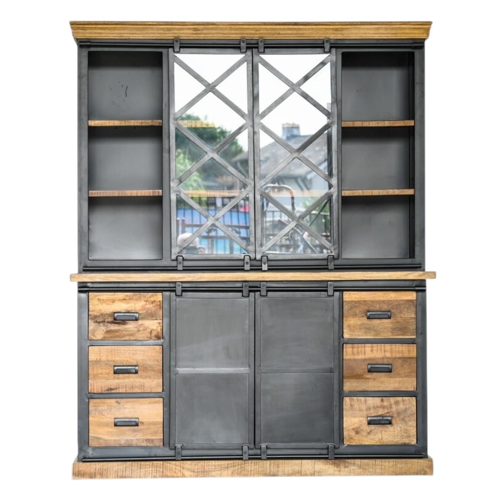 Dies ist ein einzigartiger Schrank, der komplett aus kolonialem Hartholz gebaut ist, mit Schubladen und schönen schwarzen Metallschiebeelementen, die diesem Schrank