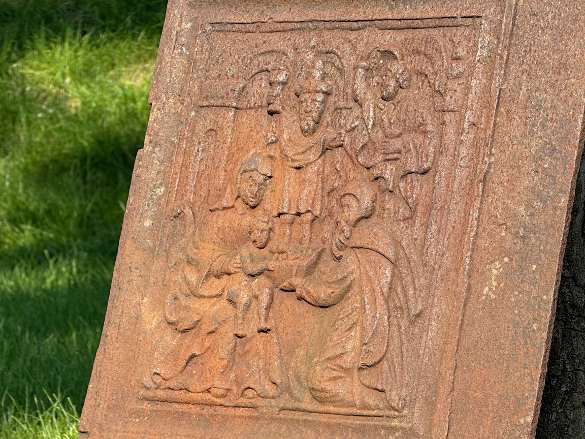Antieke haardplaat, groot, oud tafereel, vintage gietijzer, rustiek.