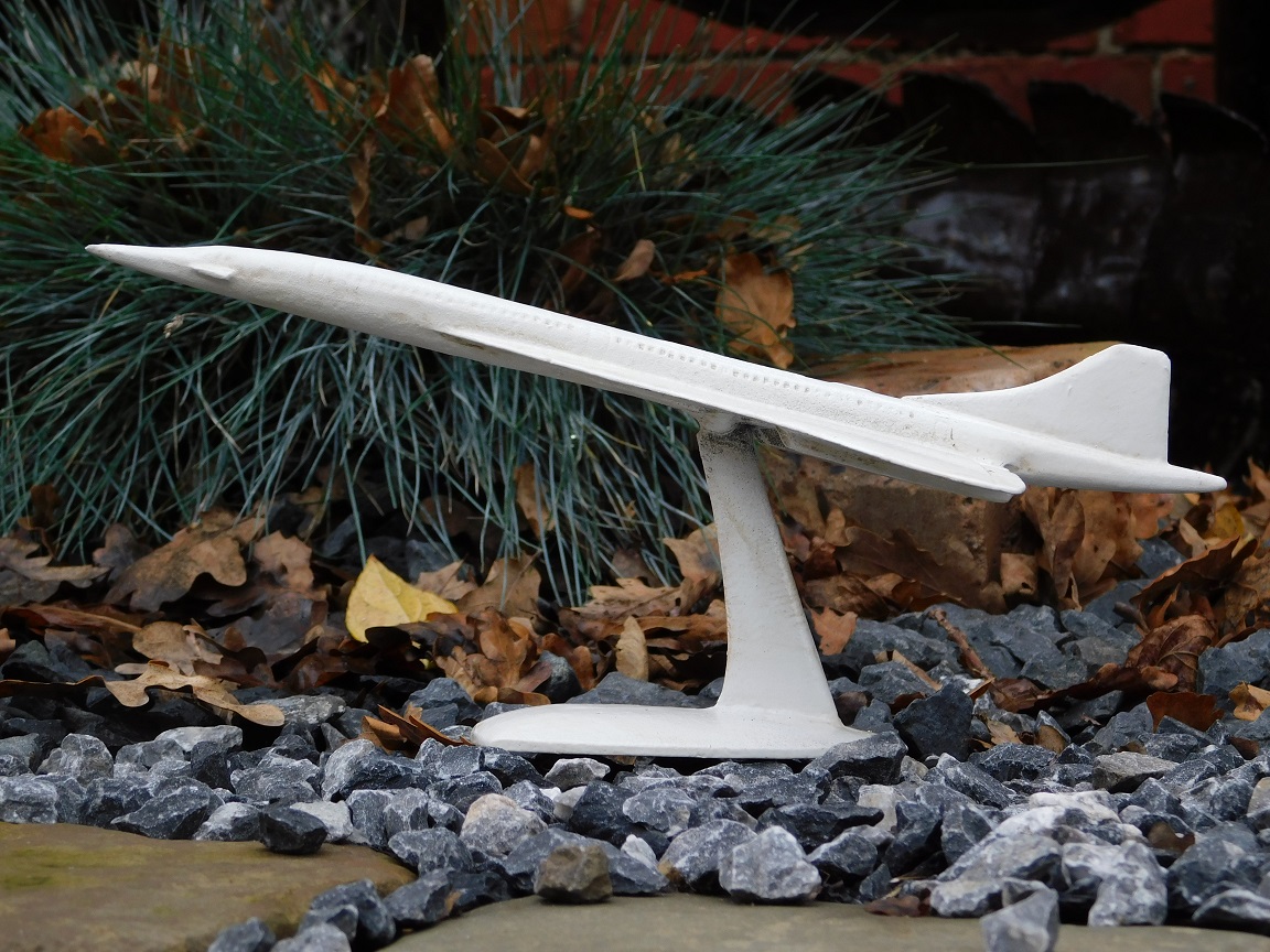 Holen Sie sich mit dieser robusten Concorde-Skulptur aus Gusseisen in stilvollem Vintage-Weiß ein Stück ikonischer Luftfahrtgeschichte nach Hause.