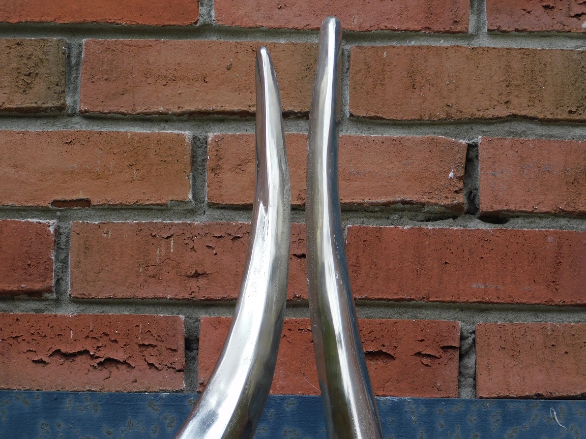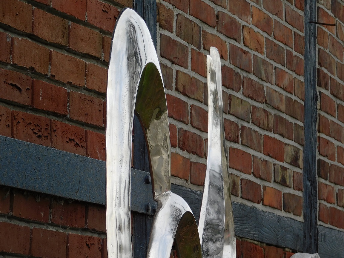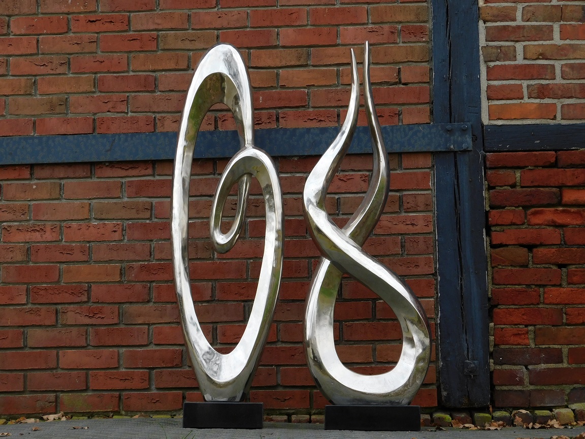 Laat je ruimte direct opvallen met deze imposante set van twee abstracte beelden, vervaardigd uit stevig aluminium in een luxe zilverkleurige afwerking. Met een indrukwekkende hoogte van ca. 130 cm per stuk zijn dit echte statement pieces die elke omgeving een moderne, stijlvolle uitstraling geven.