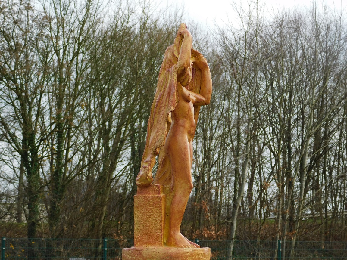 De sierlijke drapering, de subtiele lijnen en de artistieke houding geven het beeld een unieke charme.