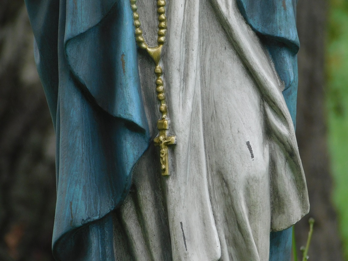 Prachtig en groot beeld van Maria met een gouden rozenkrans.