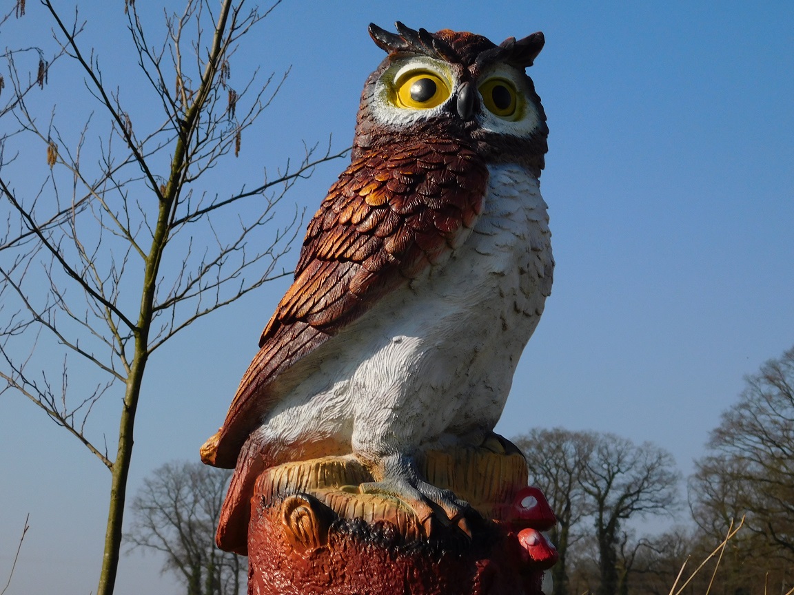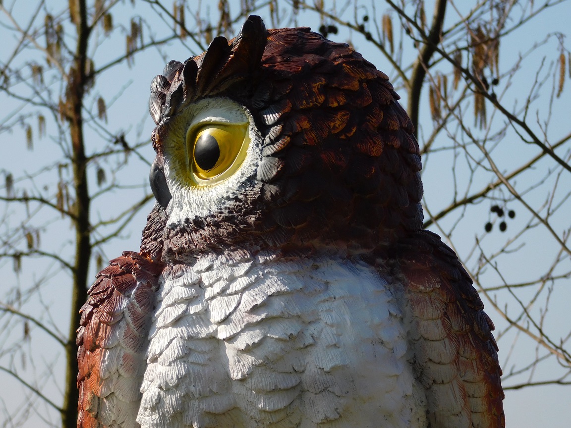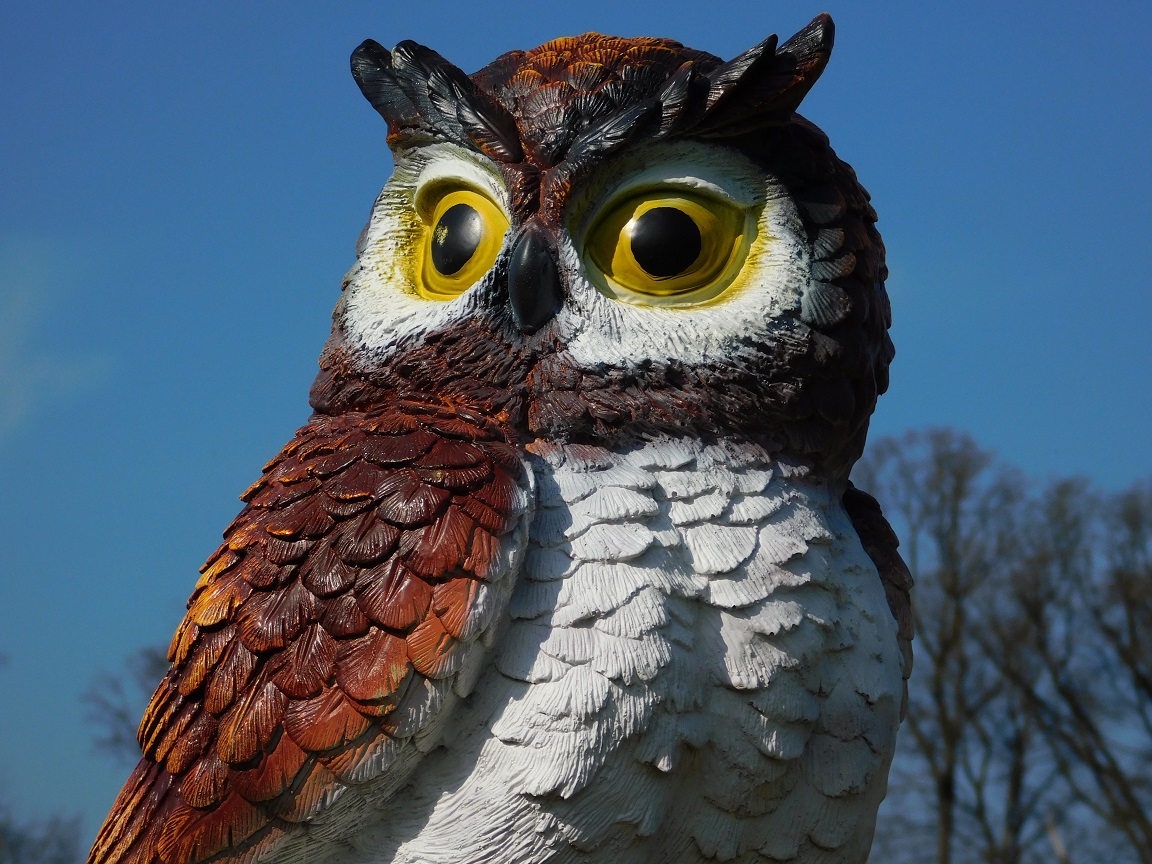 Mit einer Höhe von ca. 70 cm und einer Breite von ca. 40 cm hat diese Eulenstatue eine schöne, markante Größe.