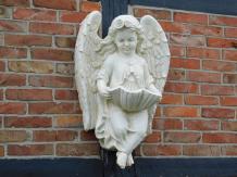Der junge Engel steht stattlich und mit ruhigem Blick da, während er mit beiden Händen liebevoll eine Vase oder ein Gefäß hält.