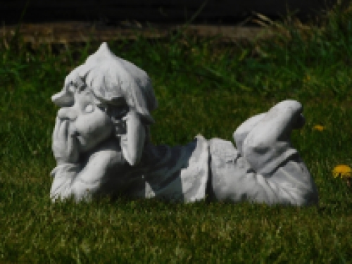 Nice statue of a mythical dwarf, lying down, completely made of stone and is weatherproof!
