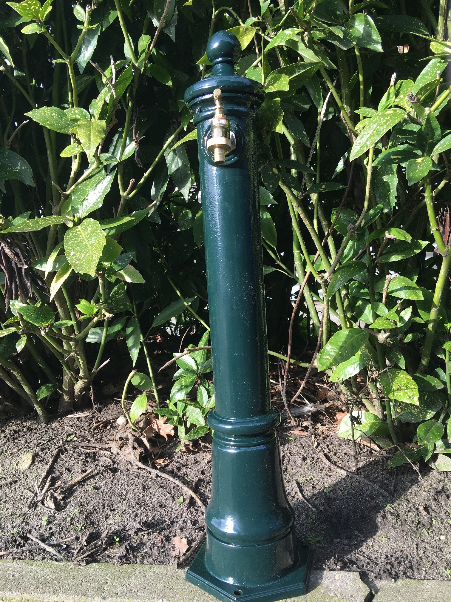 Een zeer decoratief waterkolom die prachtige staat in uw tuin of aan het tarras. Dit soort stand putten bestaan al van het begin van de eeuw. Deze fontein voor de tuin is gemaakt van aluminium met een weerbestendige afdichting in de kleur groen. Deze wordt geleverd kant en klaar voor direct opbouw met messing kraan, en een gebogen montage pijp zodat je deze kraan gemakkelijk en snel kunt installeren.