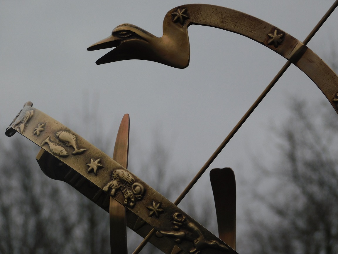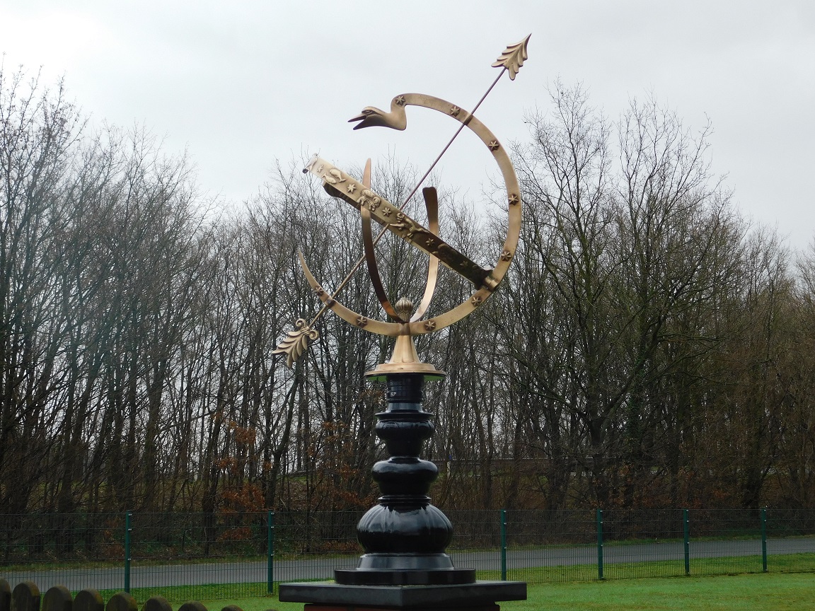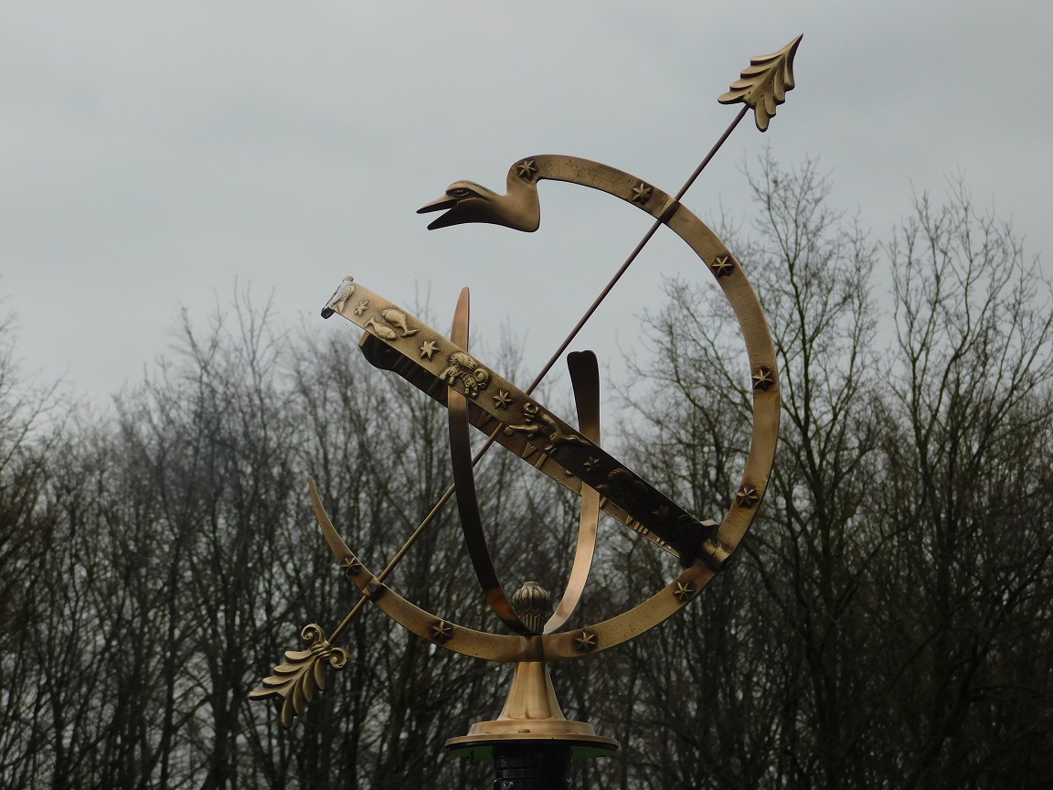 Bijzondere zonnewijzer van messing met sterrenbeeld aanduiding en romeinse becijfering, prachtige uitvoering.