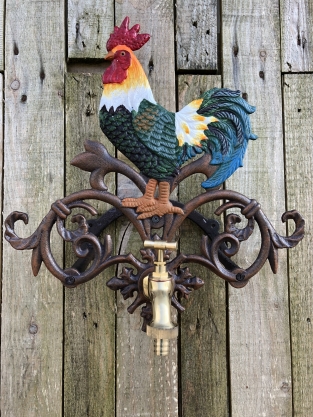 1 waterslanghouder haan, gietijzer met messing kraan in kleur, prachtig.