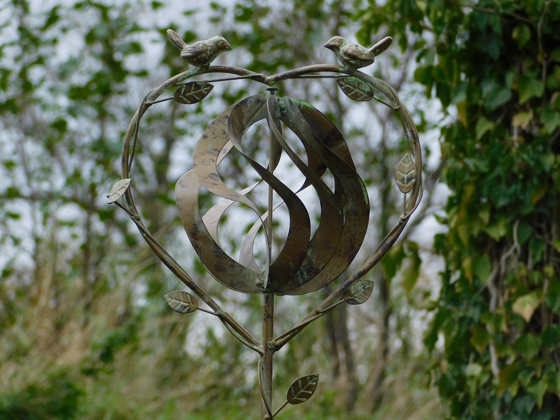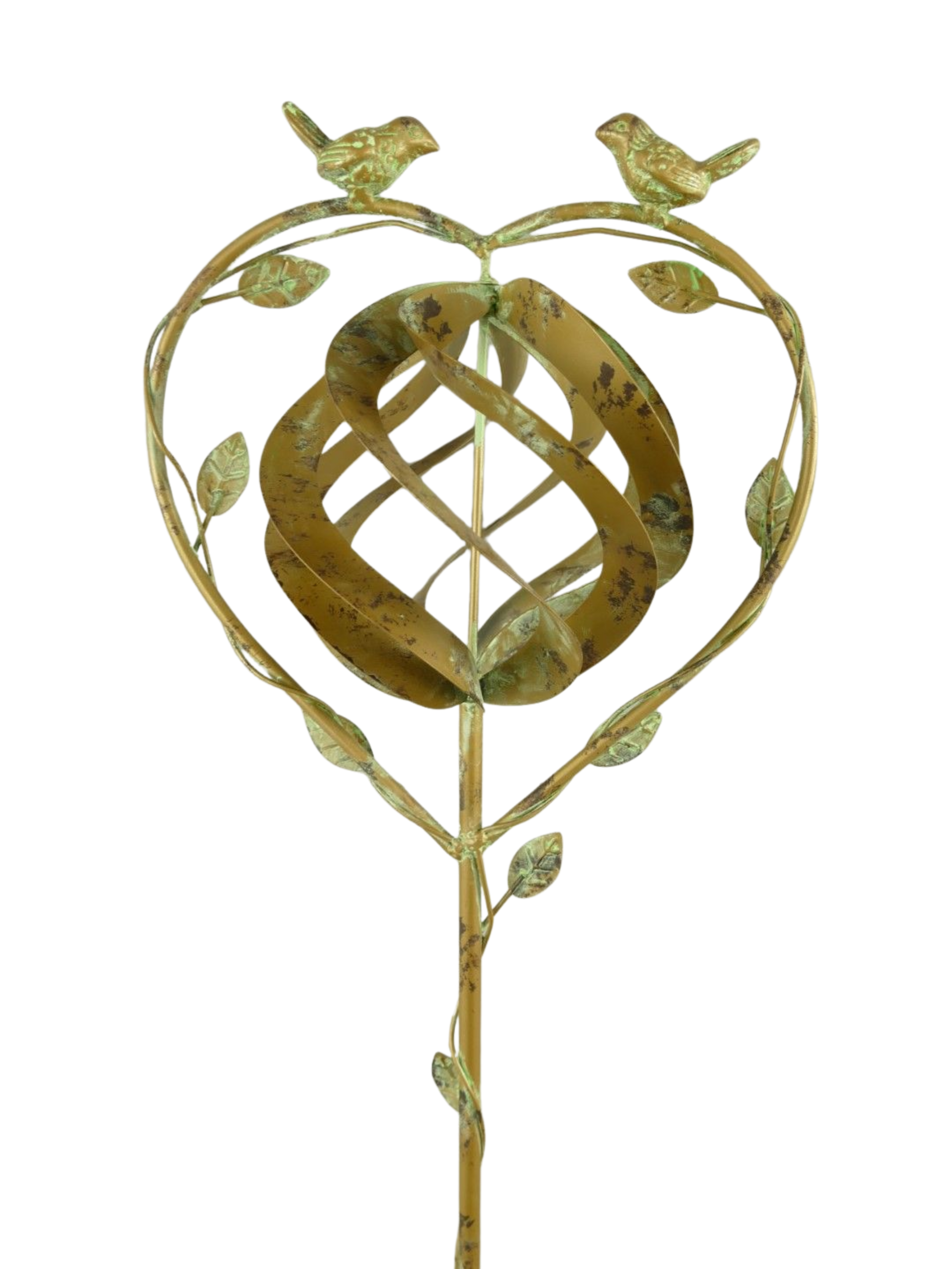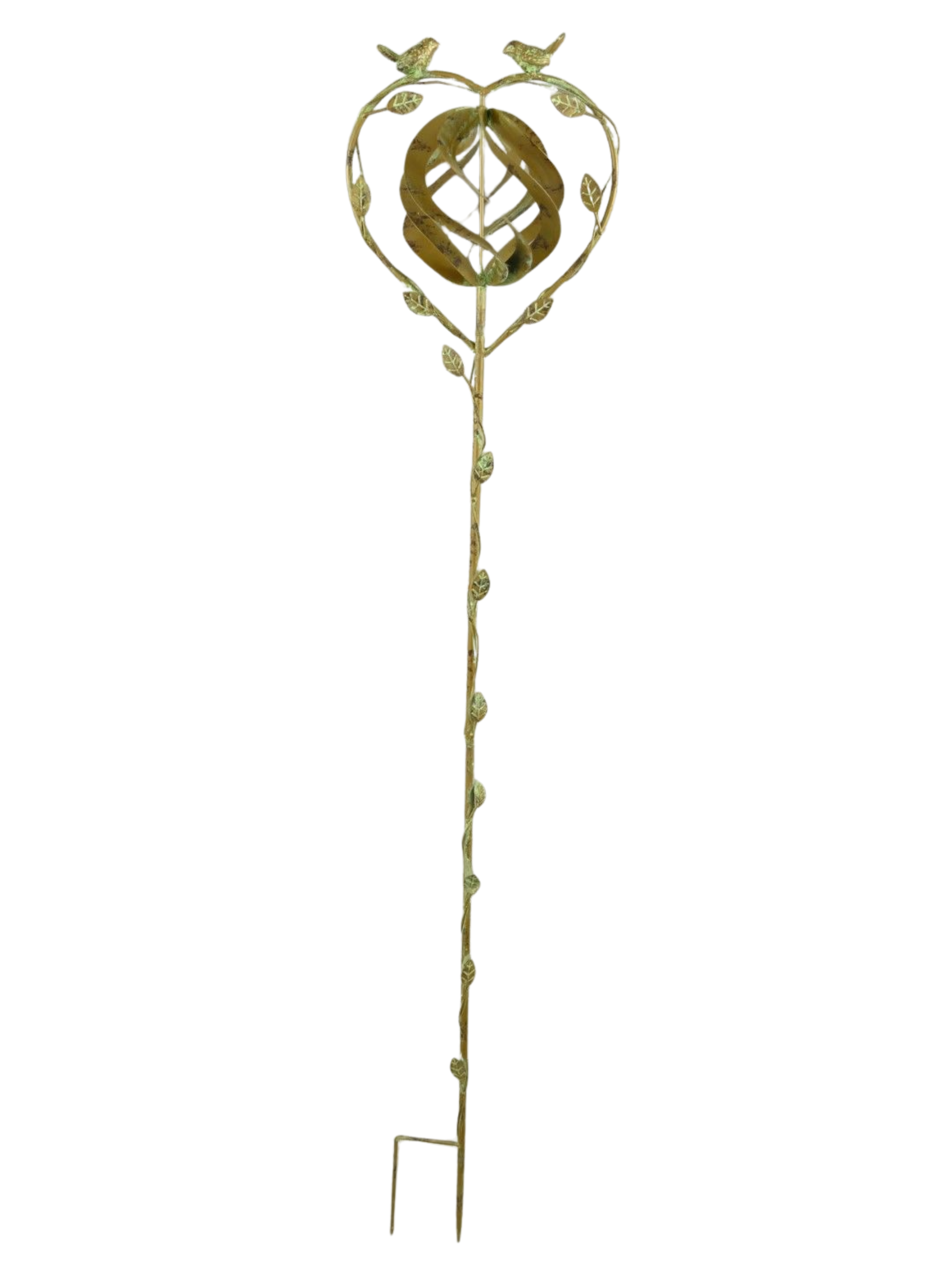 De sierlijke vorm met bladeren en vogels geeft een natuurlijke, romantische uitstraling, terwijl de spinner zorgt voor een speels bewegend effect in de wind.